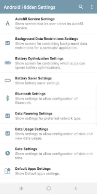 مع هذا التطبيق، ستتمكن من تجاوز متاهة الإعدادات والوصول مباشرةً إلى ما تبحث عنه. سواء كانت وجهتك هي إعدادات العرض أو الصوت، أو إدارة تطبيقاتك، أو إعدادات البطارية وتوفير الطاقة، أو حتى الخيارات الدقيقة المتعلقة بالخصوصية والأمان مثل تسجيل بصمات الأصابع أو إعدادات VPN. لقد قمنا بتضمين قائمة واسعة تضم عشرات الاختصارات، بدءاً من إعدادات وضع الطائرة وAPN، مروراً بإدارة استخدام البيانات والتخزين الداخلي، ووصولاً إلى إعدادات الإشعارات ومستمع الإعلام، وكل ما بين ذلك لتجربة سلسة لا مثيل لها.