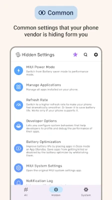 استكشف وظائف قوية مثل تعطيل تطبيقات النظام غير المرغوب فيها، وتحسين استهلاك البطارية، والوصول إلى خيارات المطور، وإدارة إعدادات الشبكة المتقدمة، وضبط خيارات العرض، والتحكم في الخصوصية والأمان، وغير ذلك الكثير. يتكامل Hidden Settings بشكل مثالي مع الإعدادات المخفية في MIUI و HyperOS، ويدعم أيضًا ميزات متقدمة لمنصة Samsung، Vivo، Oppo، Realme، و Infinix. إنه الرفيق المثالي لكل من يقدر قوة أدوات مثل MIUI Downloader، MIUIes ROMs y Apps، و Sam Helper، ليمنحك تجربة تحكم لا مثيل لها.