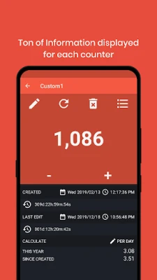 انغمس في عالم من التخصيص الذي لا حدود له؛ بإمكانك اختيار الألوان المفضلة لديك لكل عداد، أو الاستفادة من مجموعة واسعة من الألوان المحددة مسبقًا لتناسب ذوقك واحتياجاتك البصرية. كما يتيح لك التطبيق تحديد قيم افتراضية لعداداتك، مما يضمن لك بدء العمل من النقطة التي تختارها. لا يقتصر الأمر على العد فقط، بل يغوص بك هذا التطبيق في أعماق بياناتك، مقدمًا لك إحصائيات شاملة ومعلومات تفصيلية لكل عداد. بالإضافة إلى ذلك، يوفر سجلًا زمنيًا دقيقًا لكل عملية قمت بها، مما يمنحك نظرة عميقة وشاملة على جميع التفاعلات التاريخية مع عداداتك.